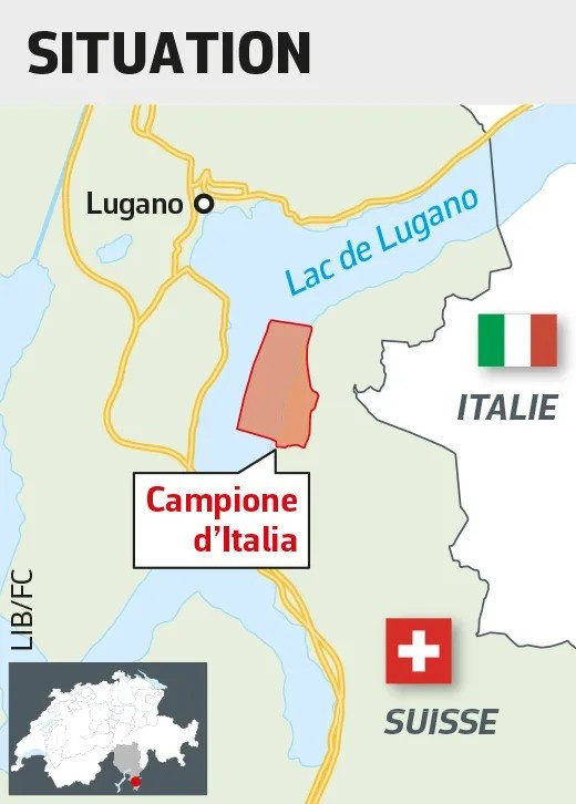 瑞士南部的提切诺州(瑞士的意大利语州)境内有一块意大利的飞地——坎皮奥内(也被译作念金皮庸),按照行政区画分,属于意大利的伦巴第大区(意大利行政区画为大区-省-市,伦巴第大区首府为米兰)。