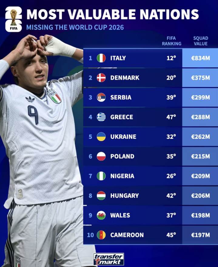 金博宝app手机版 缺席本届天下杯球队身价榜: 意大利8.34亿居首;丹麦第二