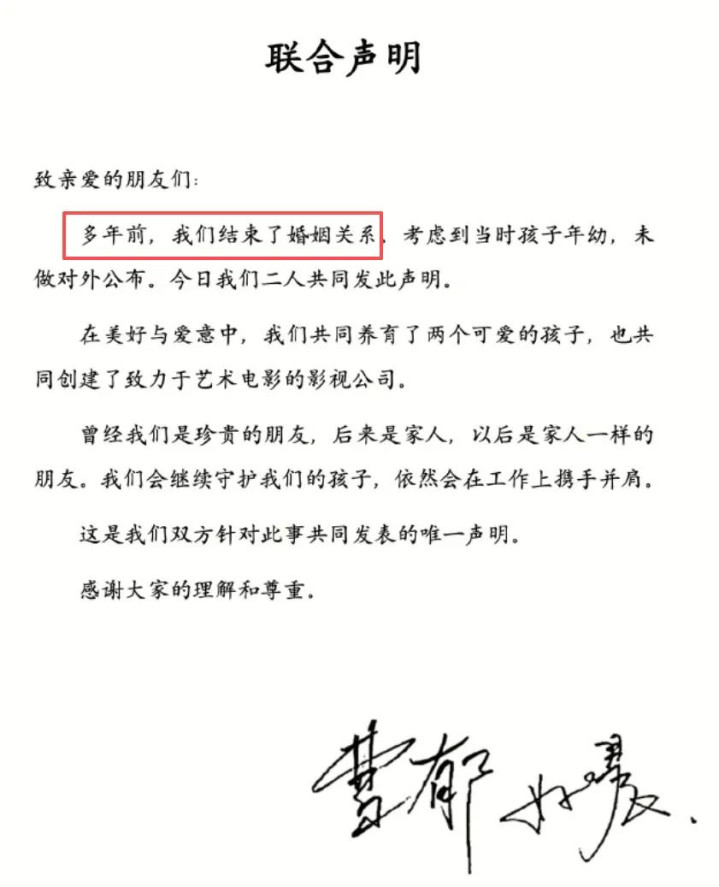 两东谈主也发布了仳离声明,还讲授了两东谈主其实还是仳离好几年了,之是以对外公布,是因为费心孩子小。还施展两东谈主共同开有公司,以后依然会是分不开的职责伙伴。